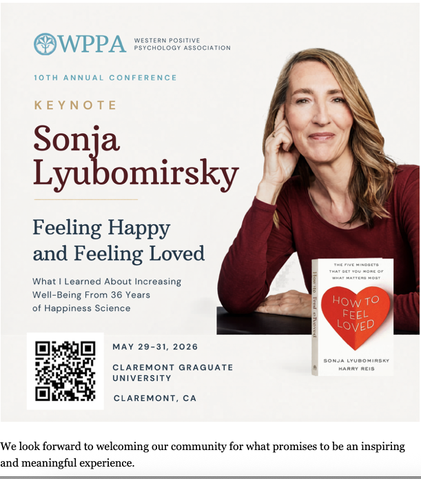 Our WPPA 10th Anniversary three-day conference at Claremont Graduate University will begin Friday evening, May 29th featuring Keynote Speaker Sonja Lyubomirsky – Feeling Happy and Feeling Loved: What I learned About Increasing Well-Being From 36 Years of Happiness Science.
